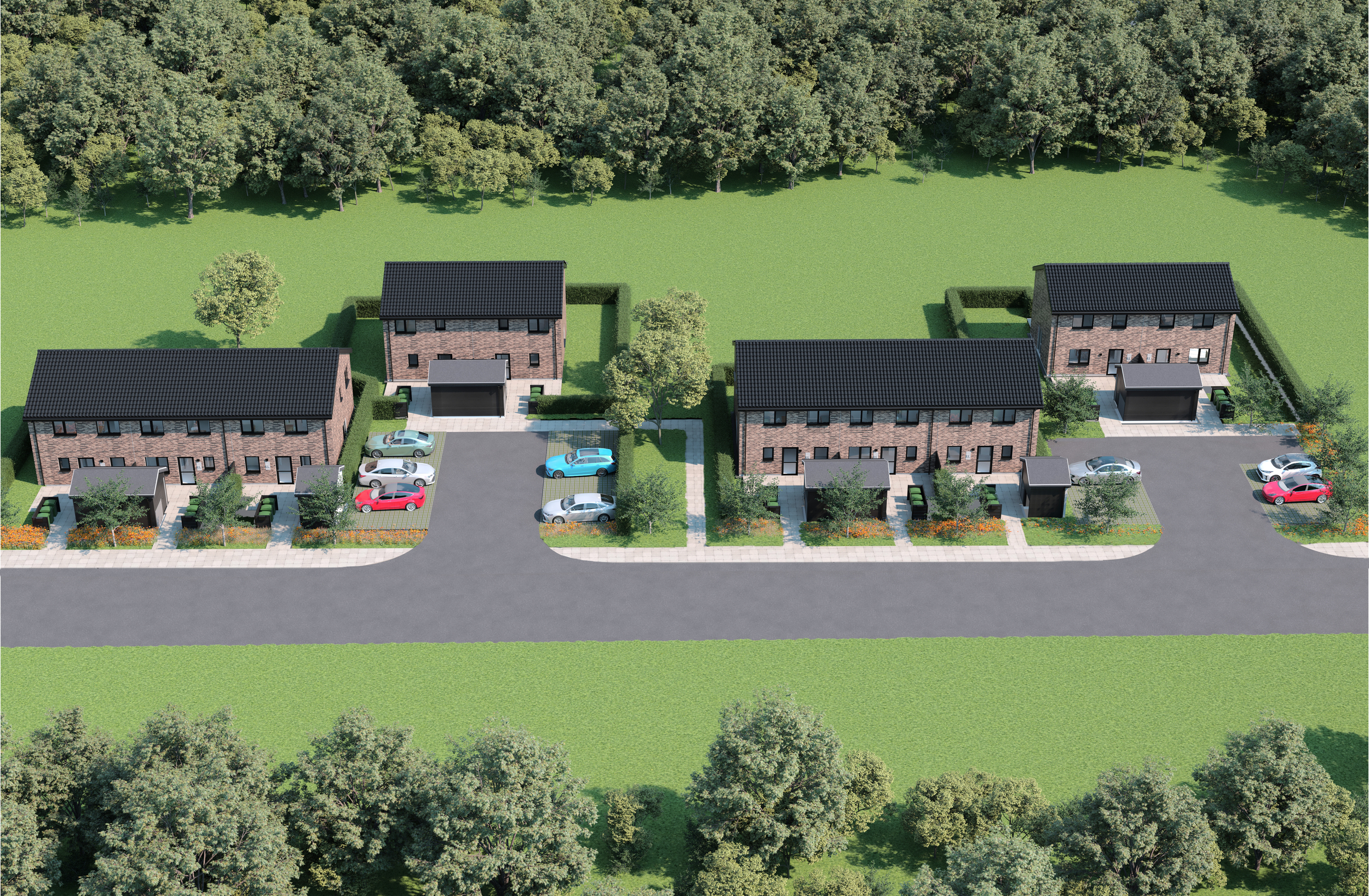 Husene er beliggende på et trygt og roligt vænge, hvor trafikken er minimal, og børn kan derfor lege trygt på vejen og på de grønne fællesarealer i området.