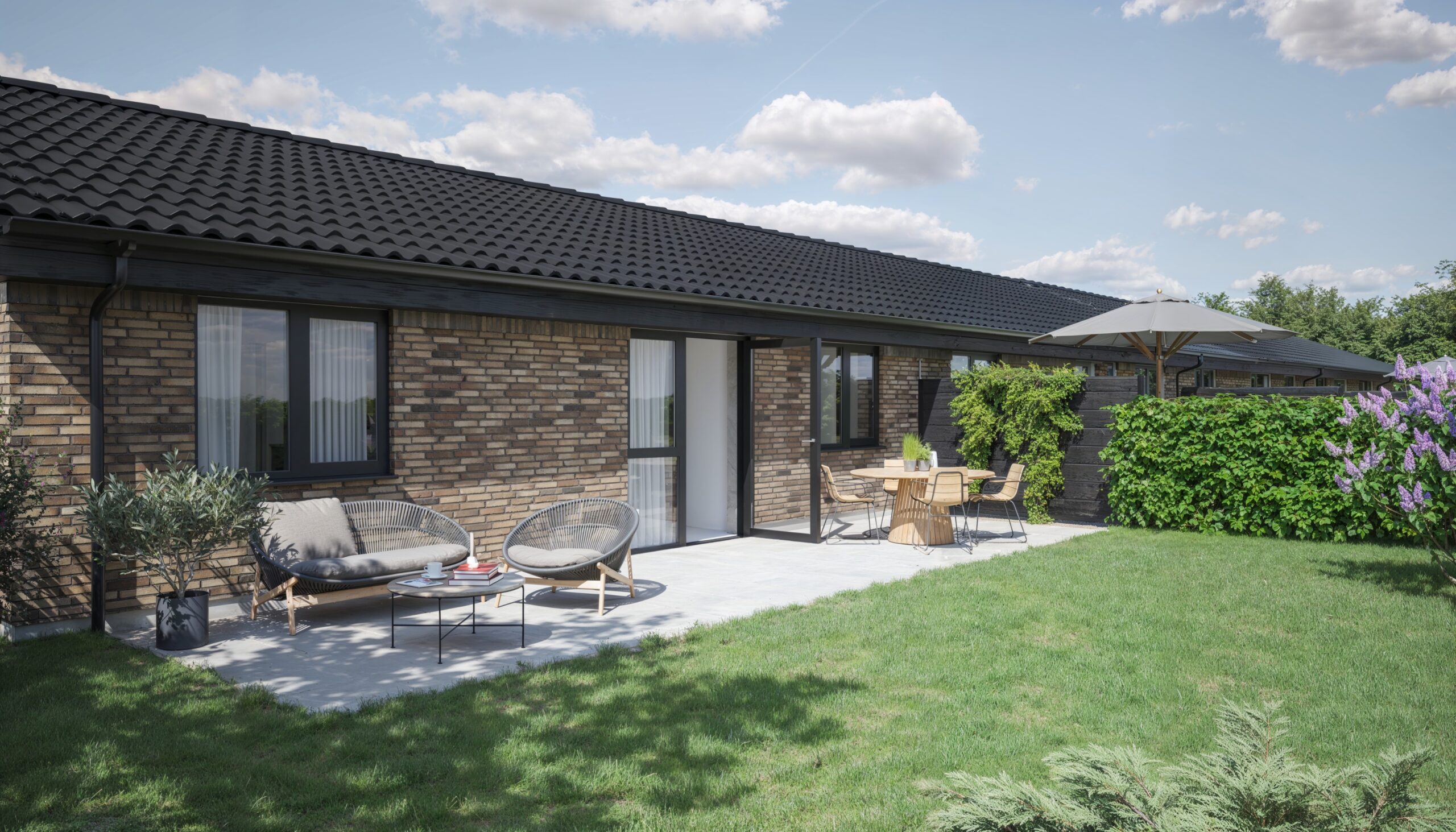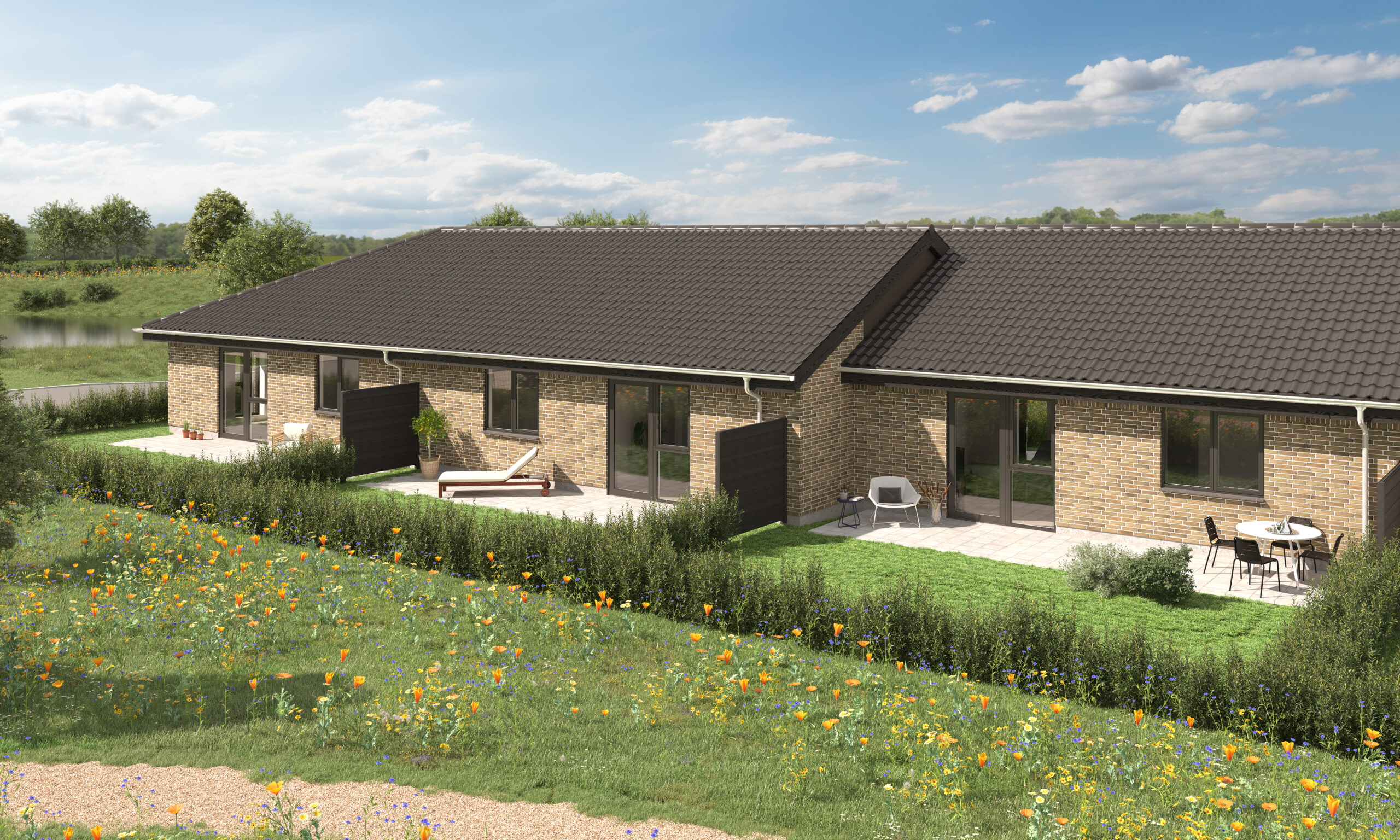 Alle boligerne opføres i ét plan, og er placeret i klynger mellem grønne fællesområder. Hver bolig får desuden egen have og to flisebelagte terrasser.