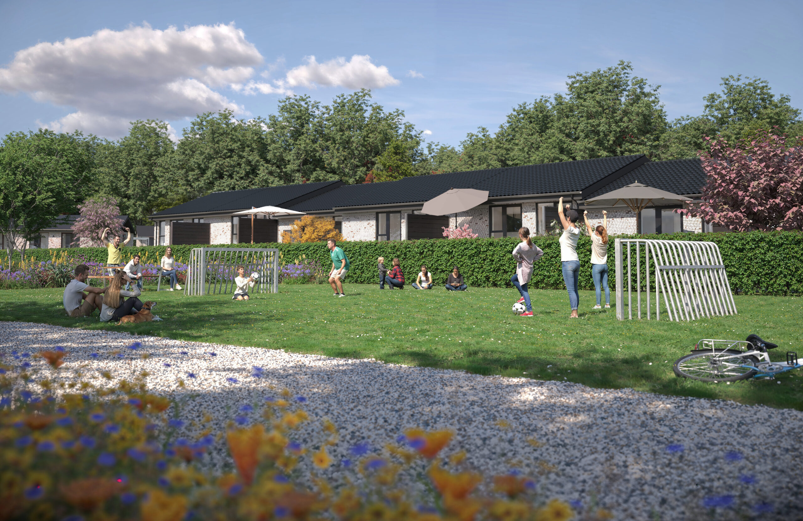 Der etableres grønne fællesarealer med fællesskabende aktiviteter samt fælles parkering med mulighed for opladning af elbiler.