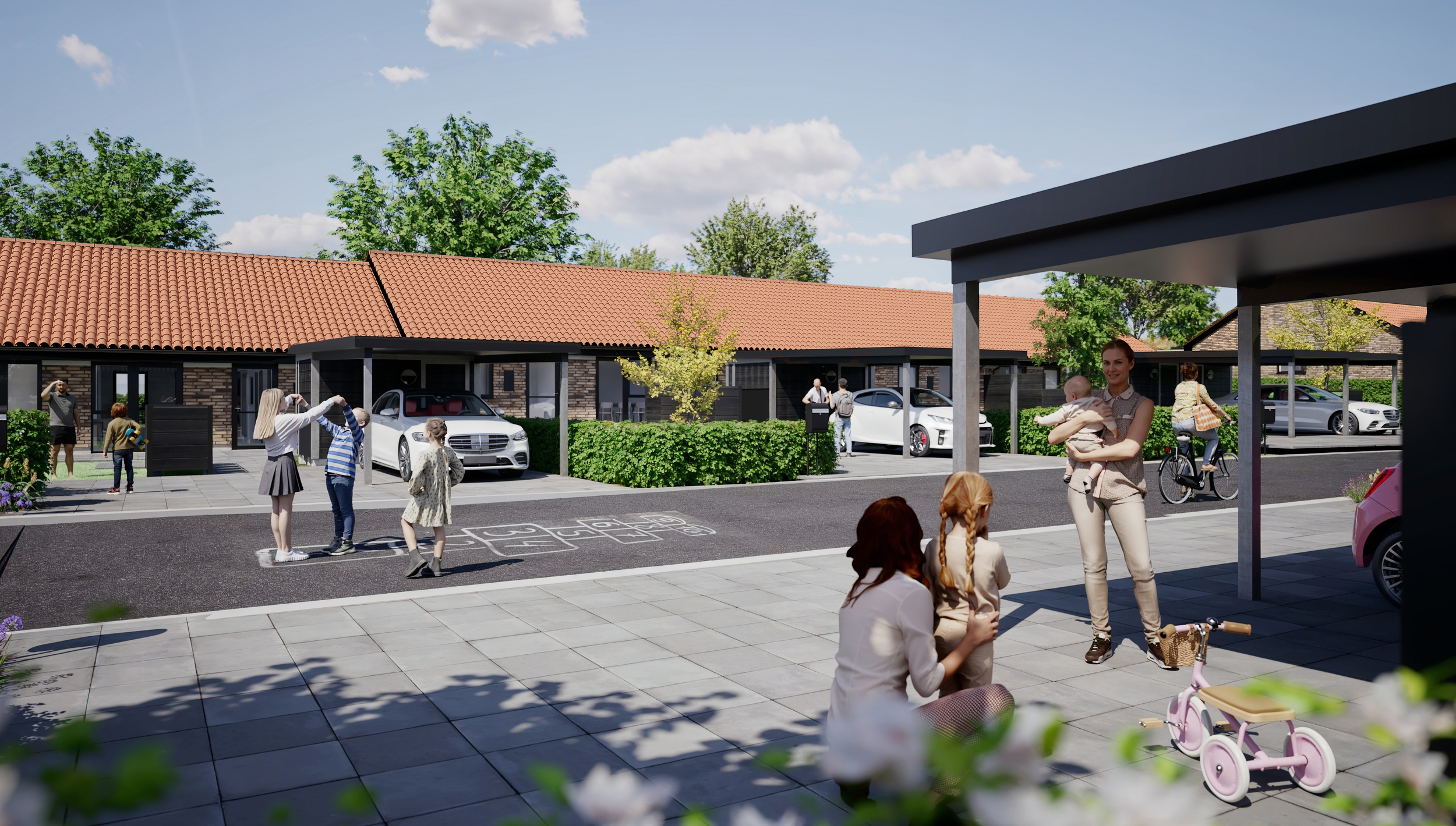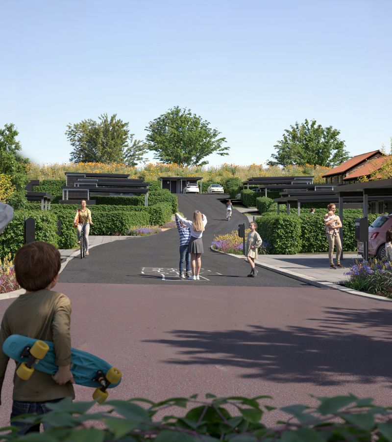 Husene er beliggende på et trygt og roligt vænge i Tølløse, hvor trafikken er minimal, og børn kan derfor lege trygt på vejen og på de grønne fællesarealer i området.